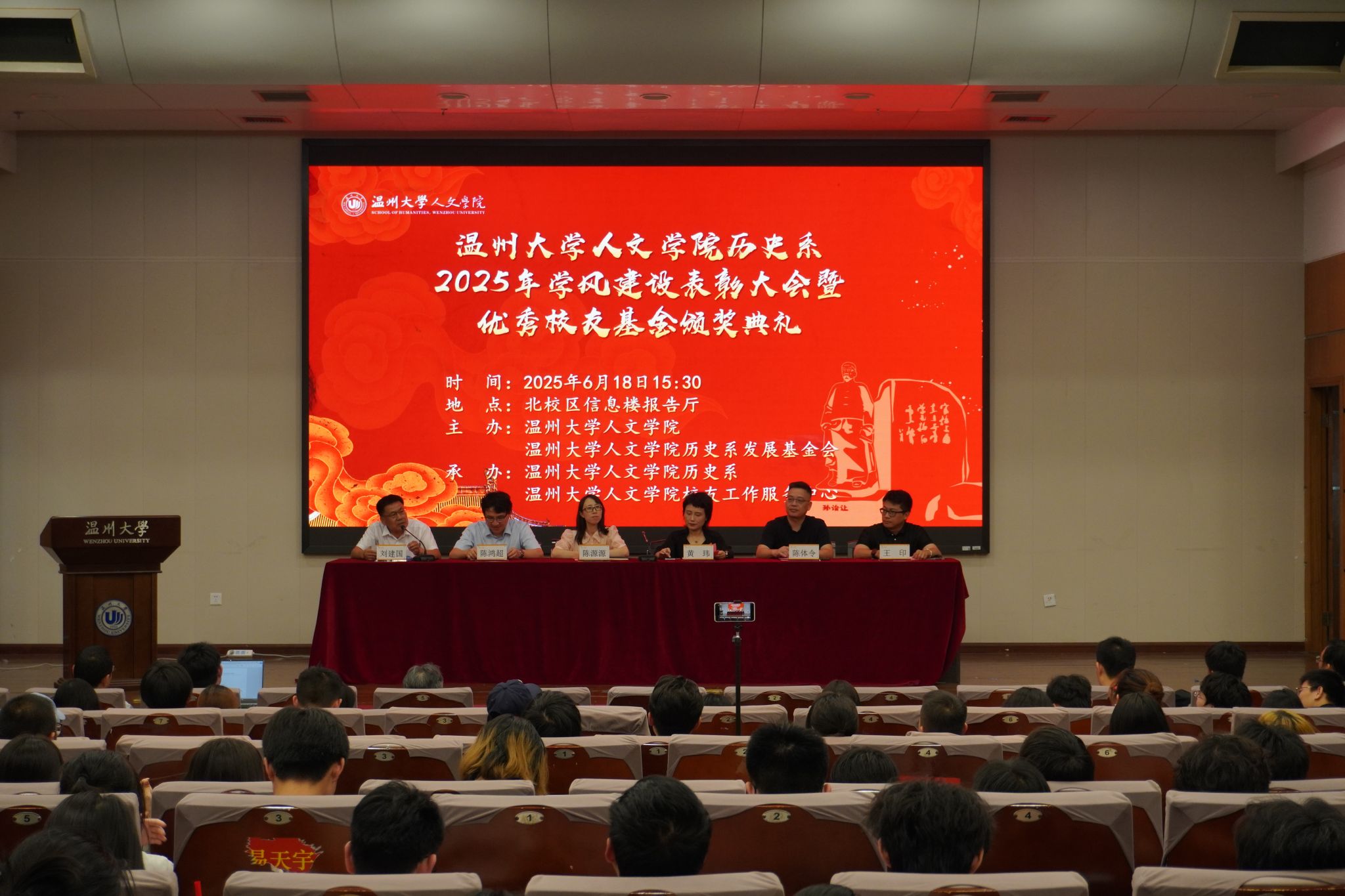 2025年6月18日下午,402cc永利历史系2025年学风建设表彰大会暨优秀校友基金颁奖典礼于北校区信息楼报告厅隆重举行。大会由402cc永利历史系发展基金会会长刘建国主持。402cc永利副院长陈源源,院党委副书记黄玮,副院长陈鸿超,历史系主任王印,98 级历史专业校友、浙江安防职业技术学院人工智能学院党总支书记陈体令,历史系教师代表,学院辅导员以及历史系全体学生出席。