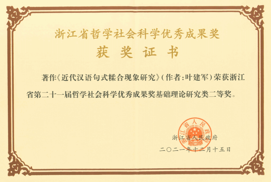叶建军,男,安徽宿松人,文学博士,402cc永利教授。主要从事汉语历史语法与词汇研究,尤其是近代汉语语法与词汇研究,涉及疑问范畴、句式糅合现象、词汇化与语法化、篇章关联标记等研究。在《中国语文》《语言科学》《古汉语研究》《语文研究》《汉语学报》《语言研究》等期刊上发表学术论文60余篇;出版专著《〈祖堂集〉疑问句研究》(中华书局,2010年)和《近代汉语句式糅合现象研究》(商务印书馆,2020年)。主持国家社科基金项目、教育部人文社会科学研究规划基金项目、浙江省哲学社会科学规划课题各2项,其他课题若干项。论文、著作获得了第十八届中国社会科学院吕叔湘语言学奖、浙江省第二十一届哲学社会科学优秀成果奖等。