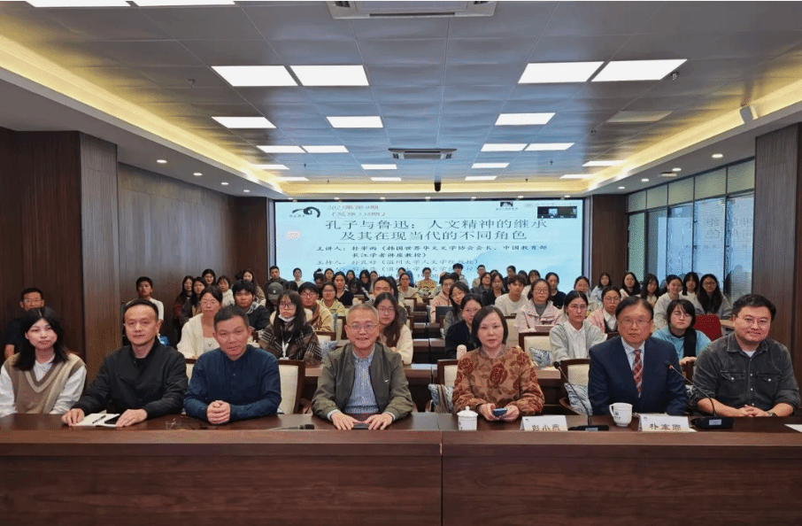 2025年11月11日晚,韩国世界华文文学协会会长、中国教育部长江学者讲座教授朴宰雨应邀在我校育英图书馆作了一场题为“孔子与鲁迅:人文精神的继承及其在现当代的不同角色”的专题讲座。本次讲座由我院院长、图书馆馆长孙良好教授主持,教授彭小燕参与探讨。