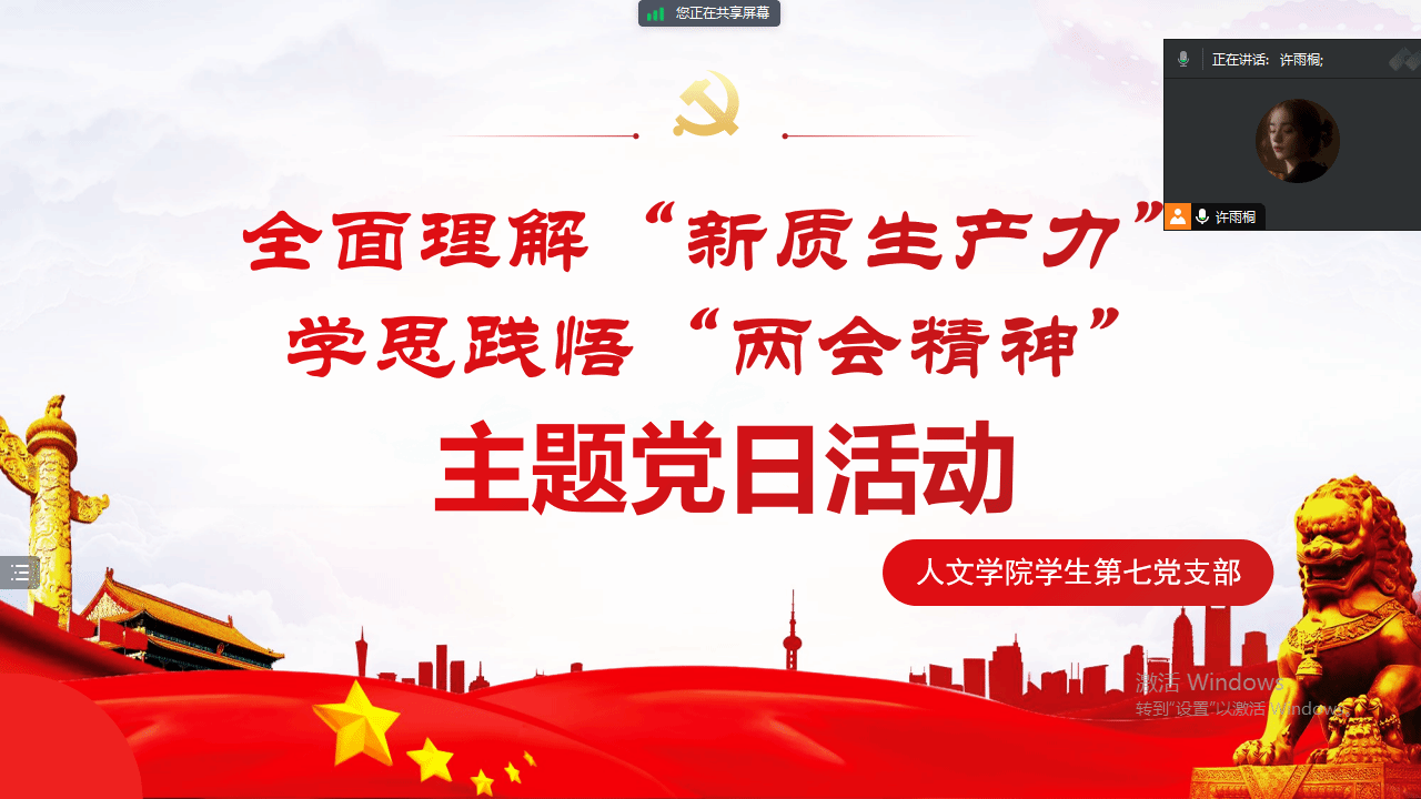 为深入学习贯彻全国两会精神,2024年3月27日晚,我院学生第七党支部在腾讯会议上举行了以全面理解“新质生产力”,学思践悟“两会精神”为主题的党日活动。
