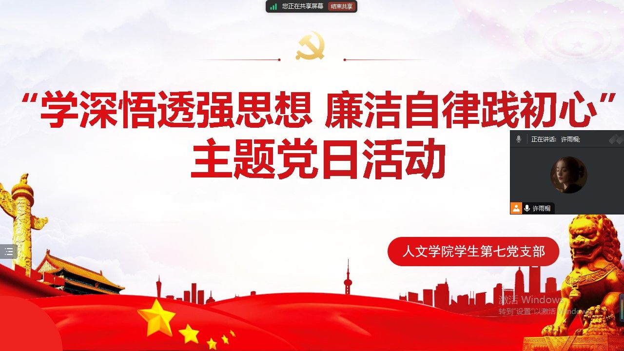 为庆祝中国共产党成立103周年,深入学习《习近平关于全面加强党的纪律建设论述摘编》(以下简称《摘编》),推进党纪学习教育走深走实,增强执行党规党纪的政治自觉、思想自觉和行动自觉,2024年7月4日晚,我院学生第七党支部在线上开展了以“学深悟透强思想,廉洁自律践初心”为主题的党日活动。会议由支部宣传委员许雨桐主持。