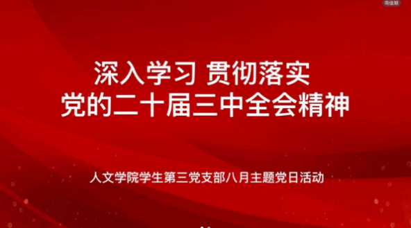 为深入学习领会党的二十届三中全会精神,深刻领会和把握进一步全面深化改革的主题、重大原则、重大举措、根本保证,8月5日晚,我院学生第三党支部组织开展了以“深入学习贯彻落实党的二十届三中全会精神”为主题的党日活动。会议由周佳颖同志主持,支部书记谭黄老师领学,支部全体党员参会。