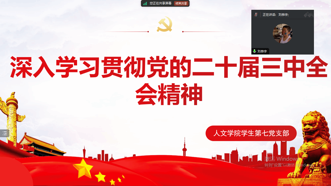 中国共产党第二十届中央委员会第三次全体会议(以下简称为党的二十届三中全会)于2024年7月15日至18日在北京召开。为深入学习贯彻此次全会精神,2024年8月6日晚,我院学生第七党支部在线上开展了以“深入学习贯彻党的二十届三中全会精神”为主题的党日活动。会议由党支部书记刘恭宇老师主持。