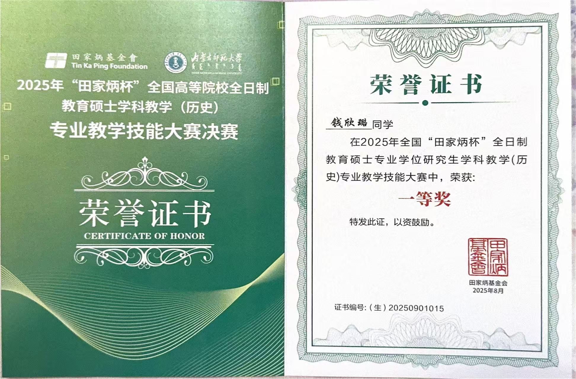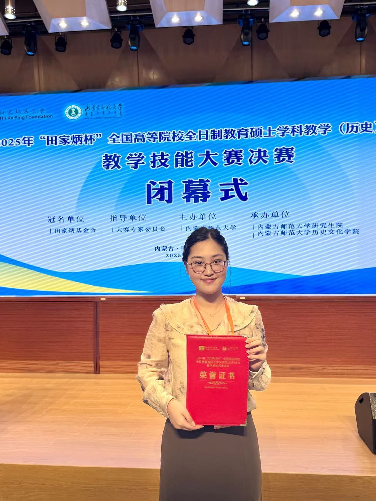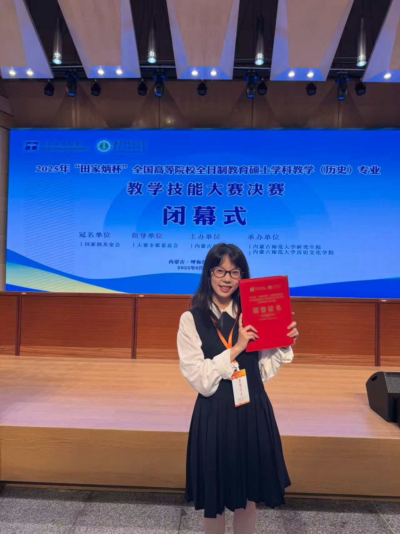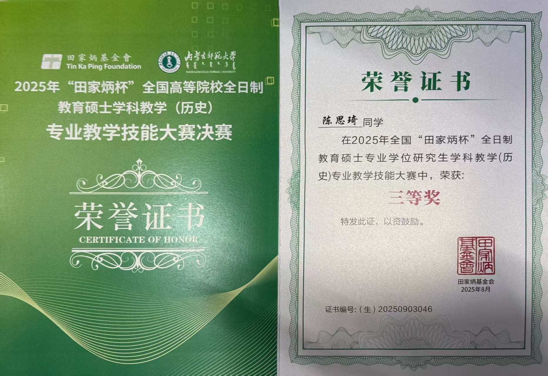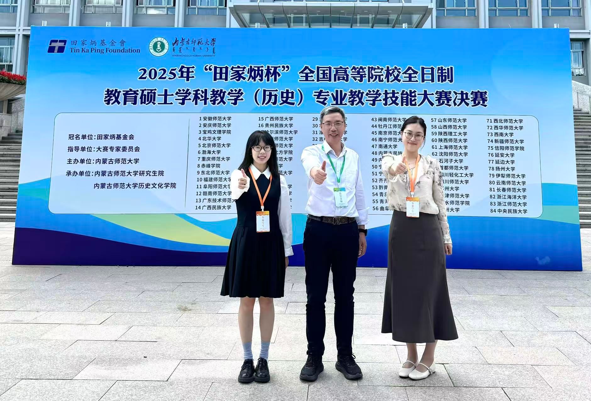 2025年8月22日至26日,2025年全国 “田家炳杯”全日制教育硕士专业学位研究生学科教学(历史)教学技能大赛决赛在内蒙古师范大学举行。该项赛事由全国教育硕士专业学位指导委员会指导,田家炳基金会冠名,内蒙古师范大学主办,吸引了来自北京师范大学、华东师范大学、华中师范大学等全国84所高校的160余名选手参赛。我院历史系学科教学(历史)研究生由蒋金崇教授带队参赛,并在决赛中取得优异成绩,23级研究生钱欣璐、24级研究生陈思琦分别荣获一等奖和三等奖,祁刚博士获“优秀指导教师”奖。