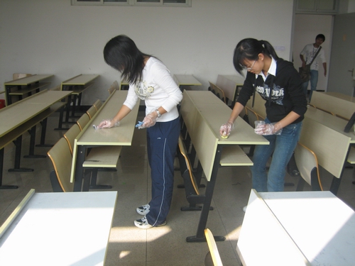 本次活动得到了院领导的大力支持和广大志愿者的积极参与。活动中,同学们弘扬吃苦耐劳的精神,人人拿工具,对402cc永利教学楼所有课桌上的污垢进行了全面的清洗。全体参加人员始终以“还课桌一张美丽的面容,还教室一份温馨的宁静”为目标,辛勤劳作,刺鼻的香蕉水顽固的污渍丝毫没有影响同学们工作的积极性。