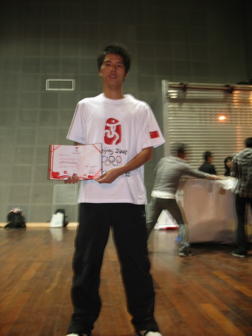 当晚,在杭州师范大学进行的浙江赛区总决赛中,我院陈斌同学在参赛宣言、奥林匹克知识抢答、参与奥运小游戏、奥运创意大比拼、为奥运献礼等环节中充分展现了个人风采,凭借其在科技奥运、人文奥运、绿色奥运领域所作出的努力和成就,以及他对奥林匹克精神深刻的理解,震撼并感染了到场的每一位观众。最终经过评委认真、严格的评选,与其他7名精英一起脱颖而出,荣获“联想中国高校08奥运火炬护跑手”资格。