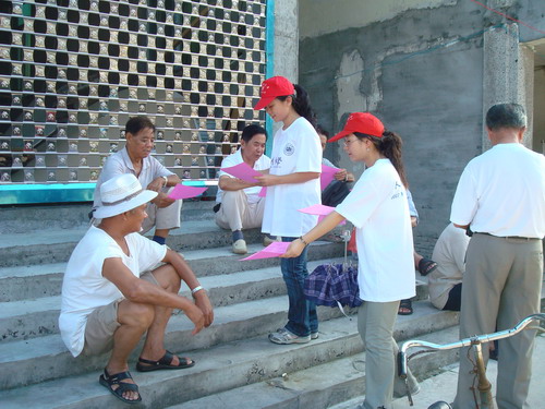 随后,402cc永利青年志愿者按原定计划分成几个小组,挨家挨户地进行宣传,炎炎烈日,并没能驱散广大青年志愿者的热情。每一个志愿者都认真细致地为广大村民进行讲解环保知识,尽量用浅俗易懂的语言进行解释,便于村民理解并支持“护溪行动”,支持新农村建设。经过一个多小时的宣传活动,402cc永利青年志愿者的足迹遍布每一户人家,把环保理念和环保知识传递到了每一户村民的手中。