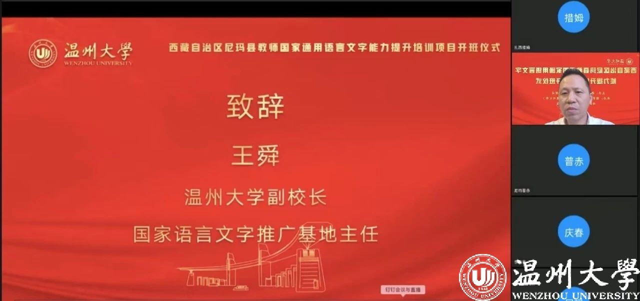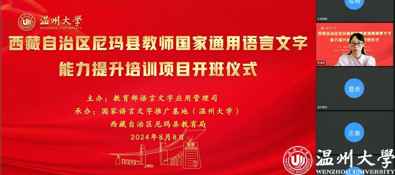 中国教育在线浙江站讯 (编辑 陈显婷 通讯员 温大萱)8月8日上午,由语言文字应用管理司主办,国家语言文字推广基地(402永利集团)、西藏自治区尼玛县教育局联合承办的“2024年西藏自治区尼玛县教师国家通用语言文字能力提升培训班”举行了线上开班仪式,国家语言文字推广基地(402永利集团)执行主任陈源源教授主持仪式。