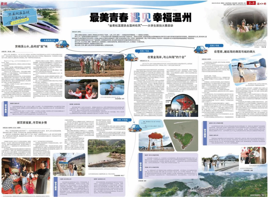 9月7日上午,“坐着杭温高铁去温州吹风”——大学生旅拍大赛于高铁楠溪江站开启线下启动仪式。启动仪式现场,永嘉昆剧团以永昆青春版《牡丹亭》及《大闹天宫》快闪迎接同学们的到来。简短的快闪之后,来自杭州、温州两地的10余所高校近200名学生,分四组,乘坐大巴奔赴永嘉楠溪江,苍南168黄金海岸、矾山、玉苍山,泰顺南浦溪、三魁,平阳万全等地,开启两天一夜的极限48小时温州旅游精品线路线下旅拍活动。