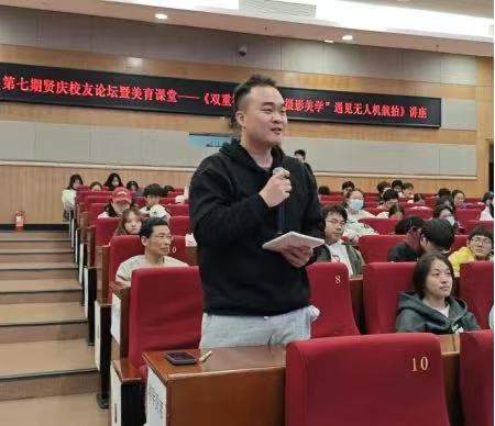 黄玮副书记以“世界那么大,我想去看看”“从不同角度看世界”以及“拥有人文底蕴的兴趣何其可贵”三句话概括自身聆听体会,并生动阐述了“审美就是生产力”的当代价值。当摄影美学遇见无人机航拍,我们共同见证了双重视野下的无限可能。在互动环节,师生围绕“艺术性与技术性如何平衡”“个人风格如何凝练”“航拍创作中的实际难点”等问题积极提问,两位校友结合自身多年创作与行业经验,给予了真诚而细致的回答,引发了现场阵阵掌声